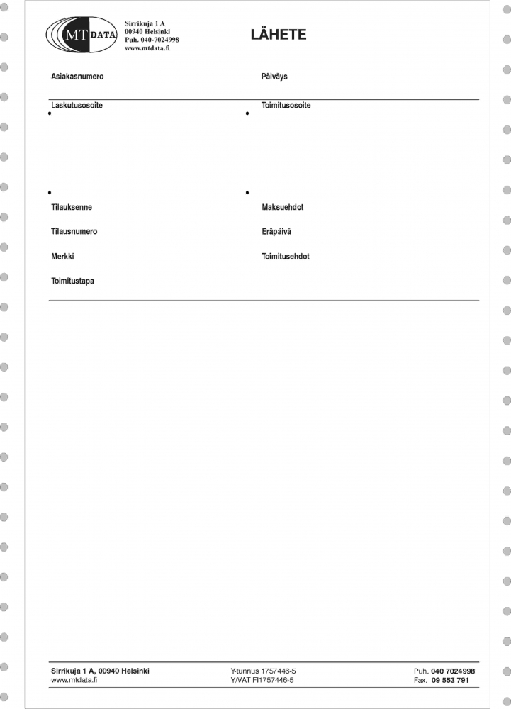 | TAVARAN LÄHETYSRahtikirjat ja osoitetarrat arkkeina ja rullina sekä ATK- ketjulomakkeet vetoreiitettynä. |